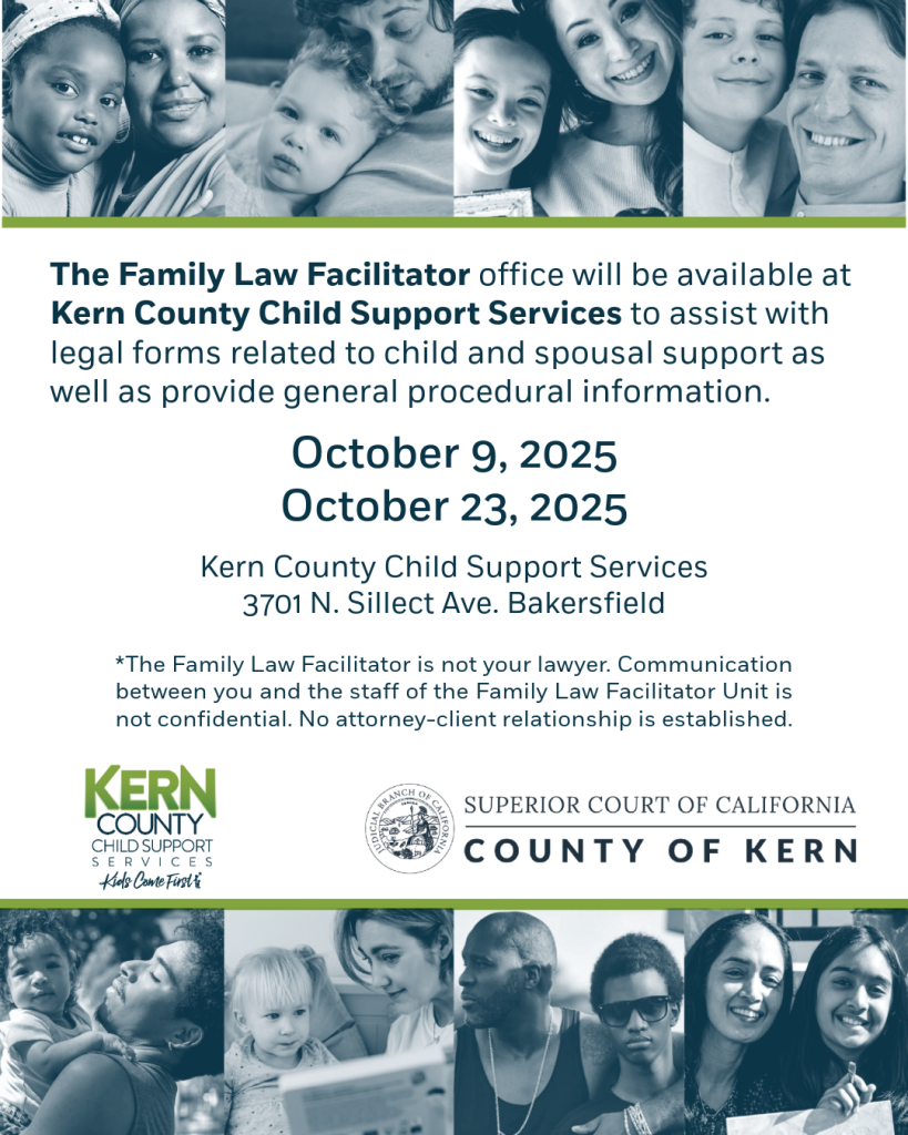 The Family Law Facilitator will be available and providing their services at Kern County Child Support Services to assist with legal forms related to child and spousal support as well as provide general procedural information.