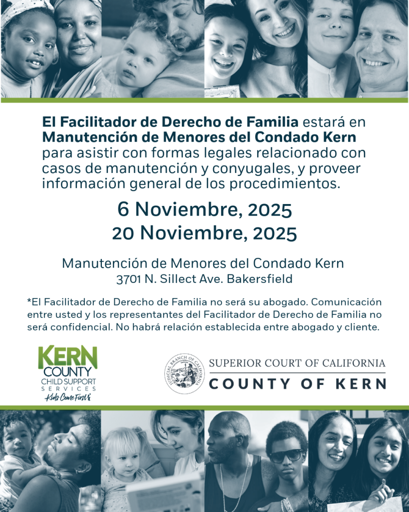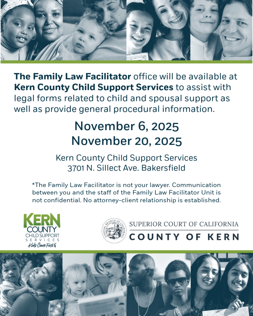 The Family Law Facilitator will be available and providing their services at Kern County Child Support Services to assist with legal forms related to child and spousal support as well as provide general procedural information.