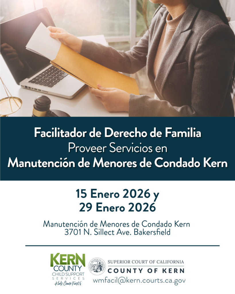 The Family Law Facilitator will be available and providing their services at Kern County Child Support Services Bakersfield office to assist with legal forms related to child and spousal support as well as provide general procedural information.